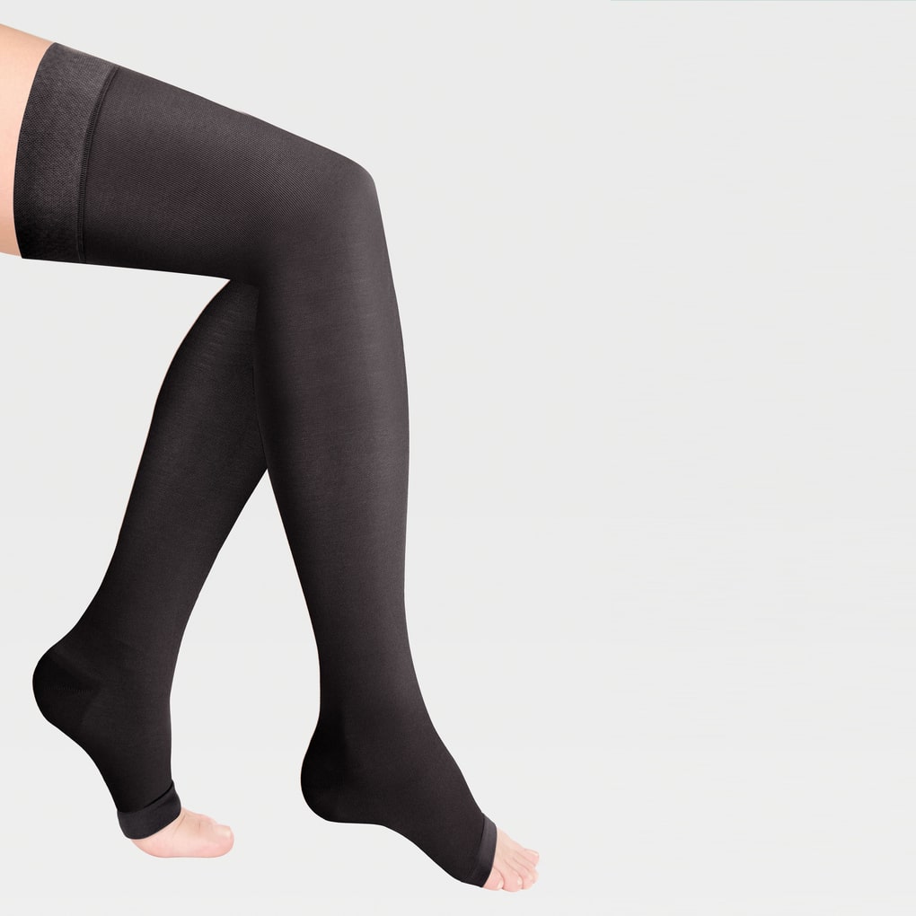 • резинка на силиконовой основе, в том числе на широкое бедро, мягко фиксирует чулок , не нарушая кровотока