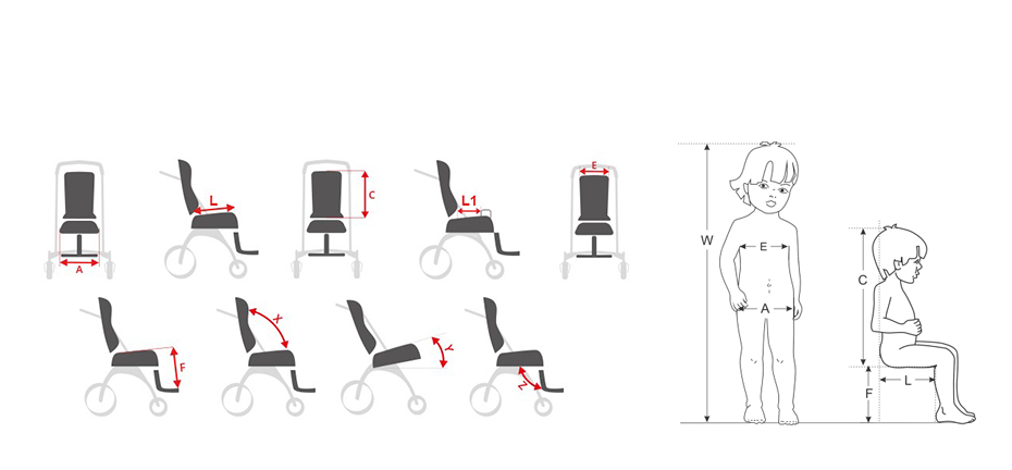 Для правильного подбора коляски рекомендуем сделать замеры как показано на картинке ниже и ориентироваться на них при подборе размера.