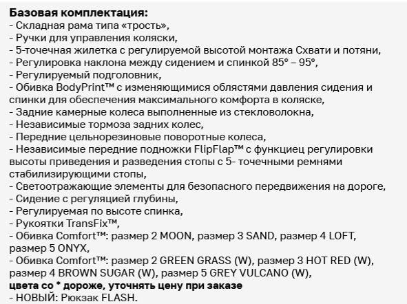 • Коляска прошла тест на столкновение и вполне соответствует требованиям норм EN ISO 7176/19, что позволяет перевозить пассажиров в этой коляске в специально к этому приспособленному транспорте, таком как автобусы и мини-автобусы. Для этого коляска снабжена системой ручек Trans Fix.