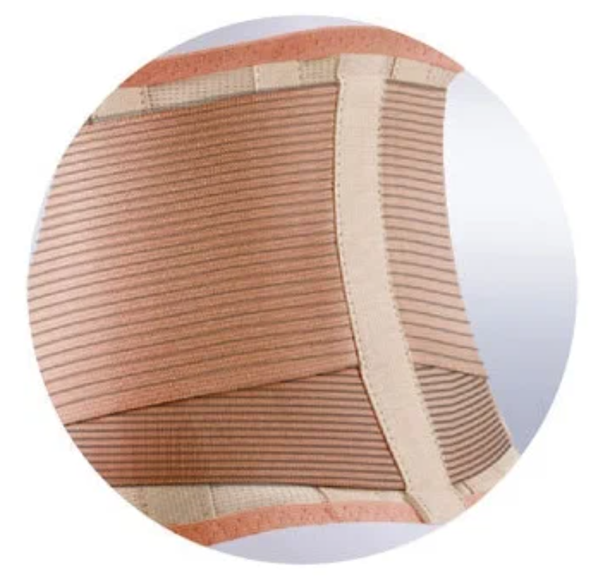 Основа пояса из эластичного полотна сетчатой структуры, усилен гибкими металлическими ребрами жесткости (от 4 до 8 в зависимости от размера) и двойными стяжками.