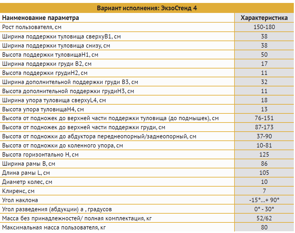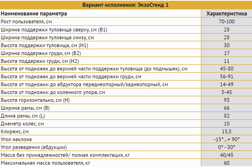 ЭКЗОСТЕНД. Размер 1: рост пользователя от 70 до 100 см, вес до 60 кг.