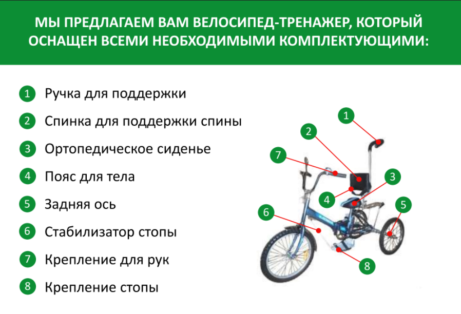 Специализированный велосипед-тренажер ВелоЛидер изготовлен с учетом особенностей детей с ДЦП. Оснащен всеми необходимыми фиксаторами и креплениями для комфортных занятий, а также возможна установка дополнительных комплектующих, исходя из особенностей каждого ребенка. Велосипед имеет более низкое передаточное число (1:1), что позволяет легко крутить педали и двигаться с невысокой скоростью.